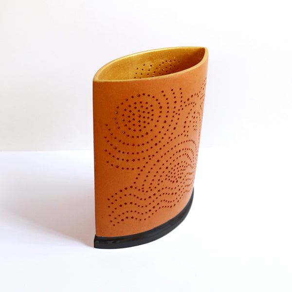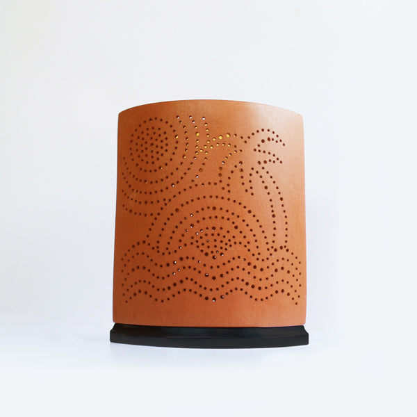 The perforated terracotta shade allows light to filter through artistically, creating dreamy patterns and a warm ambient glow. Designed to provide indirect lighting, it ensures visual comfort without harsh glare, making it perfect for relaxed and intimate spaces. The sturdy cast aluminum base adds stability while complementing the handcrafted terracotta body with a modern touch.