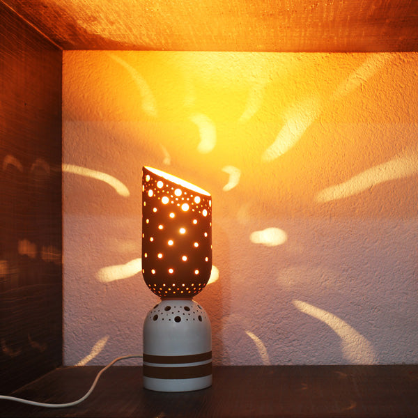 The angular upper cut adds a sharp, edgy character to the otherwise simple cylindrical body, making it visually striking without being overpowering. Crafted from terracotta, the lamp emits a warm and soothing glow, providing indirect lighting that enhances ambiance without causing glare or eye strain.